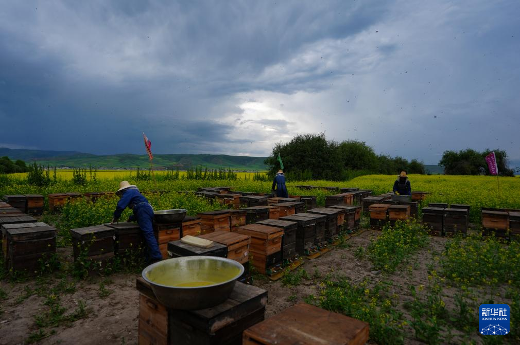 7月16日,在青海省海北藏族自治州门源回族自治县,廖春容与吴昊过滤新鲜蜂蜜。新华社记者 齐芷玥 摄