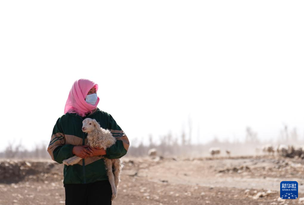 3月7日,在甘肃省张掖市甘州区碱滩镇二坝村,东宝的儿媳拉中抱着一只刚出生的小羊羔走向车辆转运点。新华社记者 张龙 摄