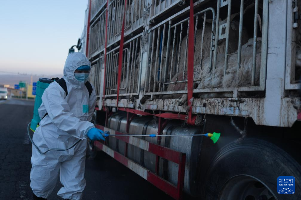 3月7日,在青海省峨堡公路动物卫生监督检查站,工作人员在对转运车辆进行消毒。新华社记者 张龙 摄