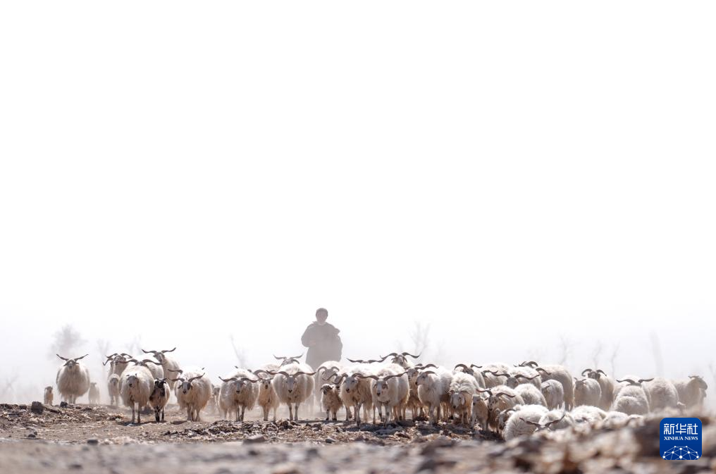 3月7日,在甘肃省张掖市甘州区碱滩镇二坝村的借牧点,东宝的儿媳拉中在放牧。新华社记者 张龙 摄